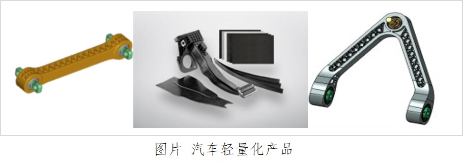 汽车产品轻量化设计。汽车质量的降低可以大幅减小地面摩擦力和速度变化带来的惯性,起到提升汽车燃油经济性的效果。汽车质量每减轻 100kg,每百公里的燃油消耗将减少 0.4~1升。公司发明了混合结构设计及成型技术,在全球率先制备出轻量化推力杆、踏板箱、控制臂等汽车用结构功能一体化系统部件,实现减重达30%-50%,助力汽车轻量化,显著降低废气排放。