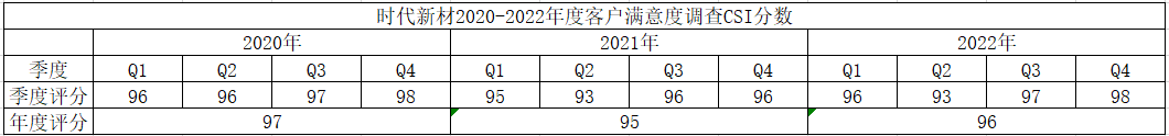 为了加强与客户的沟通,了解公司是否能满足客户的需求并对客户满意度进行信息调查回馈,我们通过线上问询、内部评核作业和客户满意度调查评分表等方式,针对相关反馈结果进行分析并持续改善,积极对应客户的需求项,解决客户遇到的问题,从而提升客户对公司的满意度,完善公司的整体形象。从2020到2022年度公司统计的客户满意度综合评估数据来看,平均已经达到了96%的年度评分并获得客户的高度认可和鼓励,同时也为接下来的业务开展垫下良好的基石。